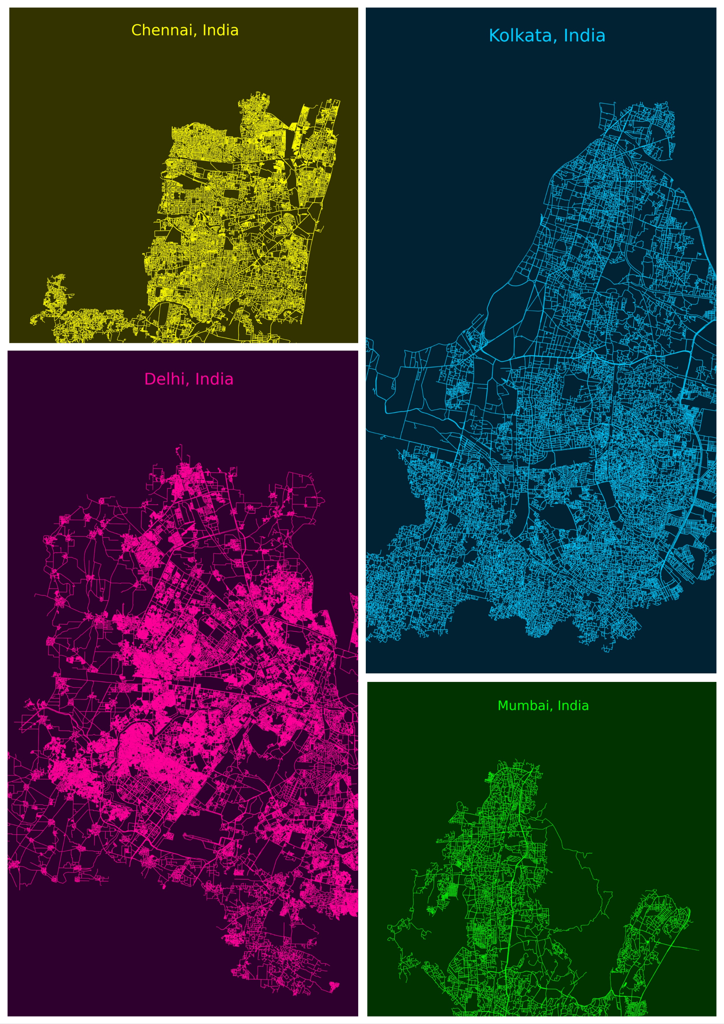 Visualisation of urban road networks for four major Indian cities using OSMnx and Matplotlib. Highlights spatial morphology through minimalist mapping